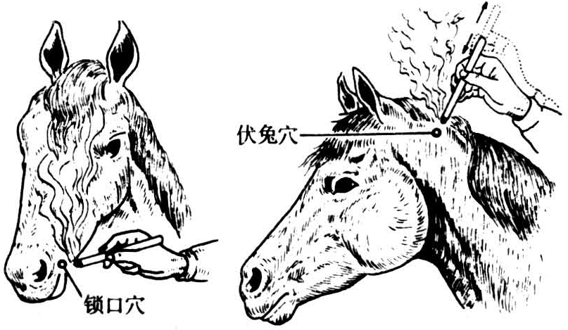 点燃艾条,对准穴位,约距0.5~1.0厘米进行熏烤,使患畜局部有温热感,灸至皮肤呈现潮红。术者可随时用手指感知温热程度,调节施灸距离,掌握施灸时间,防止灸灼烧伤。