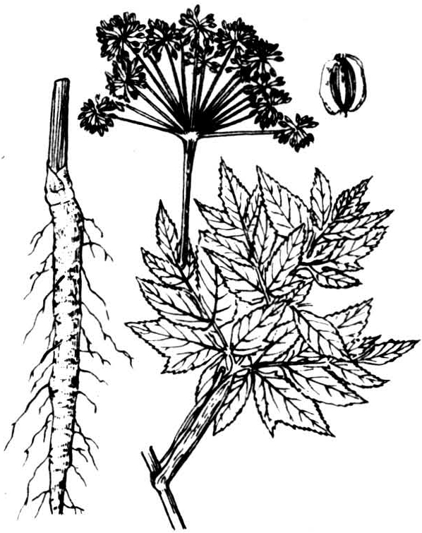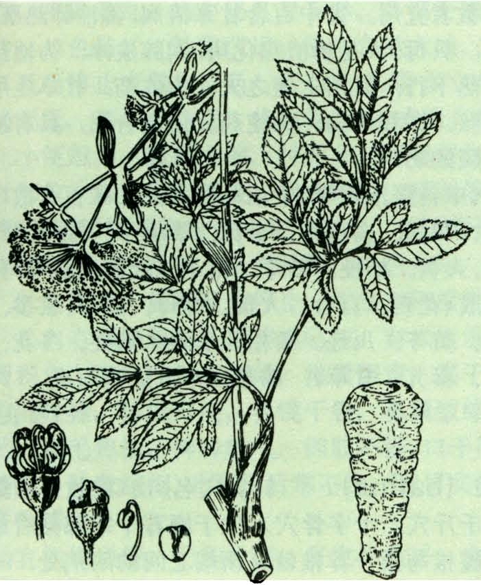 辛温解表药。出《神农本草经》。见《司牧安骥集》。又名香白芷、芳香。伞形科植物白芷Angelica dahurica(Fisch.ex Hoffm.)Benth.et Hook.f.或杭白芷Angelica dahurica(Fisch ex Hoffm.)Benth.et Hook.f.var.formosana(Boiss)Shan et Yuan的根(图1、2、3)。切片,生用。主产浙江、四川、河北、河南等地。辛,温。入肺、胃经。功能祛风解表,消肿排脓,通利鼻窍。主治:①风寒感冒,与羌活、防风、蔓荆子等配伍;风湿痹痛,与独活、桑枝、秦艽等同用。②乳痈初起,红、肿、热、痛,配瓜蒌、贝母、蒲公英等;蓄脓未溃,常与党参、黄芪、当归、升麻、穿山甲、皂刺同用,如托里透脓散。③脑颡流鼻,与辛夷、苍耳子、薄荷配伍,如苍耳子散(《景岳全书》)。④马肺热或身上生疮,配山栀子、瓜蒌根、赤芍药、川大黄、黄药子等。牛、马15~30克;猪、羊5~10克。为末或煎汤灌服。对痈疽疮毒已溃,脓出通畅者慎用。本品全草含挥发油。根含白当归素(byak-angelicin)、白当归脑(byak-angelicol)、氧化前胡素(oxypeucedanin)、欧芹属素乙(imperatorin)等。川白芷根含白芷灵(anomalin)、川白芷素(angenomalin)、佛手柑内酯(bergaptene)等。杭白芷根含呋喃香豆精(furocoumarin)、白芷毒素(angelicotoxin)、佛手柑内脂等。白当归素对冠状血管有明显的扩张作用。小量白芷毒素可兴奋呼吸中枢、血管运动中枢、迷走中枢及脊髓,出现呼吸增强,血压上升,脉搏变慢,呼吸加强,并引起流涎、呕吐;大量则发生惊厥、麻痹。煎剂对体外大肠杆菌、痢疾杆菌、伤寒杆菌、绿脓杆菌及变形杆菌有抑制作用。
