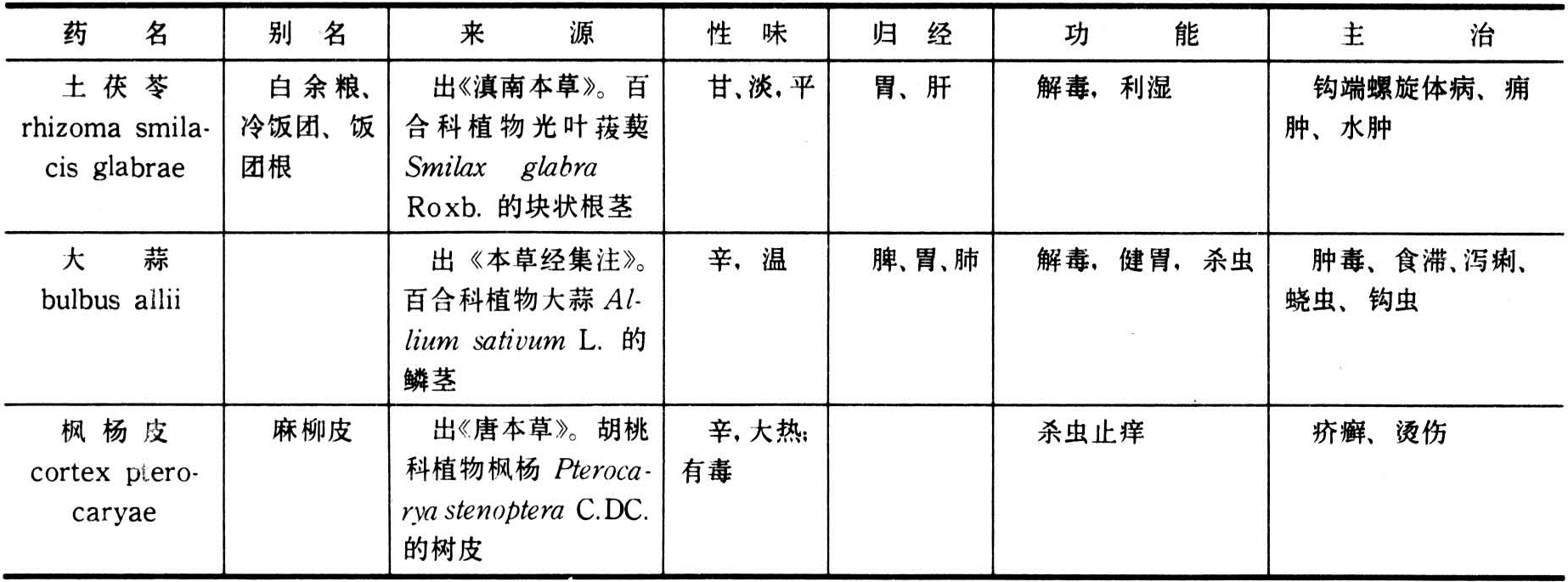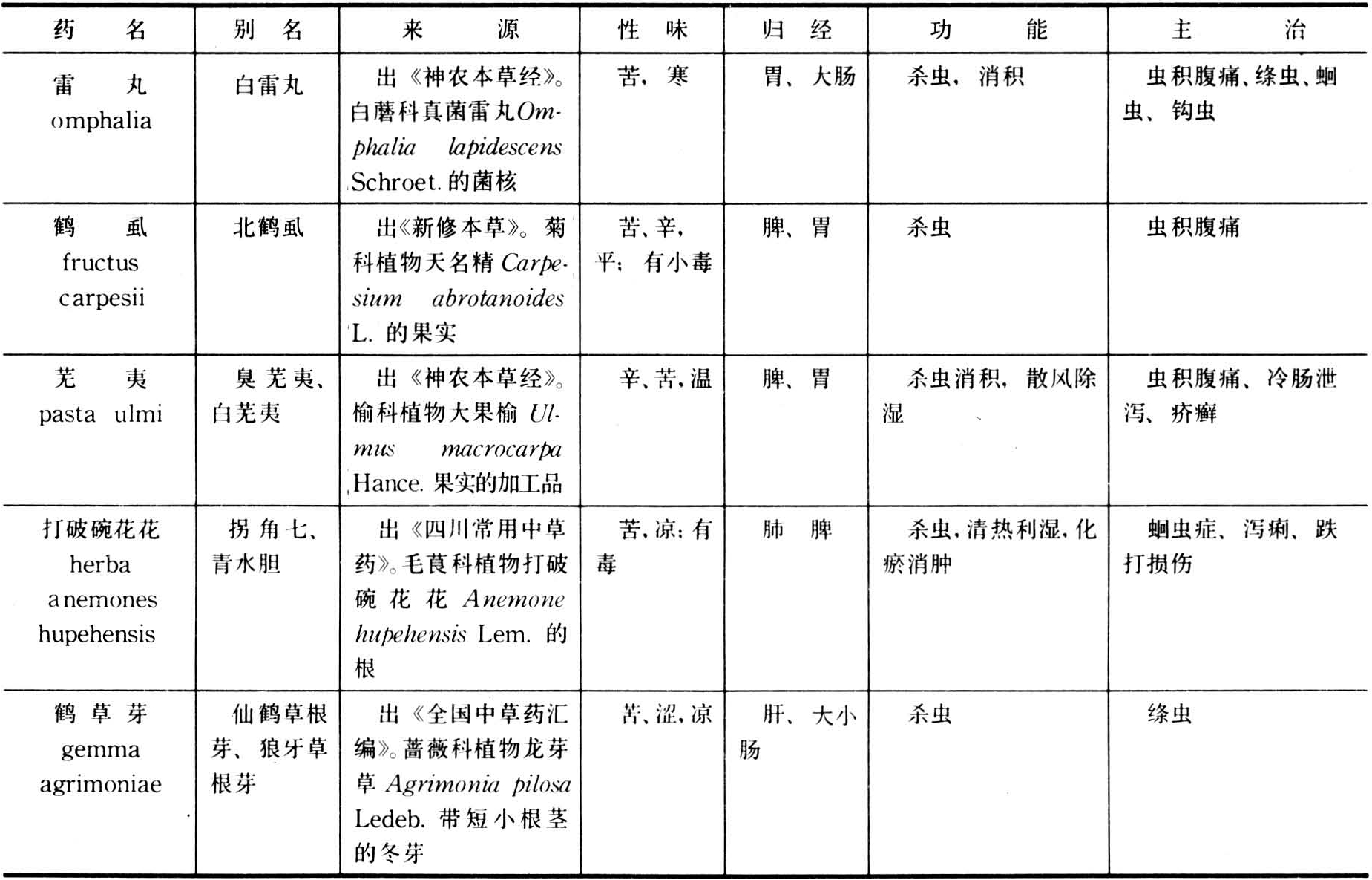 驱除或杀灭畜体内外寄生虫的药物。驱虫杀虫类药物能驱除或杀灭家畜多种寄生虫,适用于家畜的蛔虫、绦虫、蛲虫及肝片吸虫等。使用驱虫药,应根据寄生虫的种类、畜别、体质适当选择药物和剂量,酌情采用急攻、缓驱或先补后攻、攻补兼施等治则。为增强驱虫效果,一般配伍泻下药或入复方。部分驱虫杀虫药具有毒副作用,宜严格掌握用量,以免损伤正气或中毒。常用药物有使君子、苦楝皮、槟榔、硫黄、贯仲、南瓜子、钩吻,以及雷丸、鹤虱、芜夷、土茯苓、大蒜、枫杨皮、打破碗花花、鹤草芽等(表)。