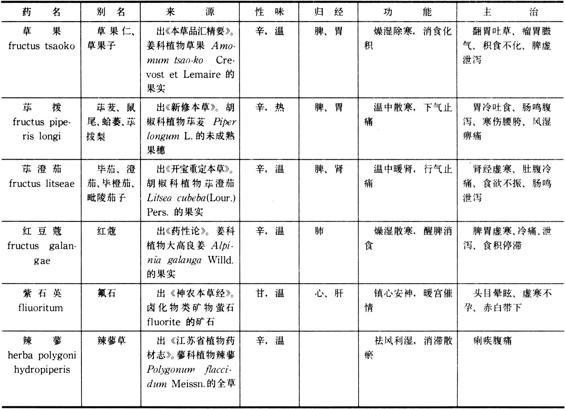 温中散寒,回阳救逆,行气止痛,治疗寒证的药物。亦称温里药。味辛性温热。主要用于寒伤于里所致的虚寒作泻、肚腹寒痛、翻胃吐逆、不食水草、口鼻冰冷、口色淡白、脉迟细的里寒证。本类药物温热燥烈,易伤阴液,对于热证和阴虚患畜慎用。常用药物有附子、白附子、肉桂、干婆、吴茱萸、草豆蔻、丁香、小茴香、大茴香、高良姜、艾叶以及草果、荜拨、荜澄茄、红豆蔻、紫石英、辣蓼等(表)。