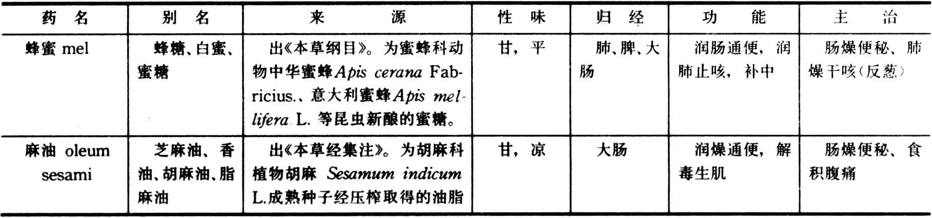 富含油质,有润滑肠道,使大便易于排出的药物。属泻下药。多为植物的种仁或果仁。主要用于津枯血虚、病后津亏、大肠燥结所致的排便困难。药力较为缓和,应根据不同病情,适当与其他药物配伍应用,以增强药效。如热盛伤津便秘,可与养阴药配伍:兼血虚者,宜与补血药配伍;兼气滞者,须与理气药配伍。常用药物有火麻仁、郁李仁及麻油、蜂蜜等(表)。