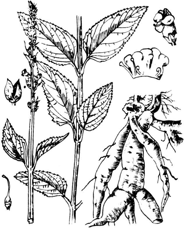 清虚热药。又名重台、黑参、元参。出《神农本草经》。见《司牧安骥集》。为玄参科植物玄参Scrophularia ningpoensis H em sl.的根(图1、2)。立冬前后采挖。除去茎叶、须根。晒干或烘干。切片生用。主产浙江、四川、湖北等地。甘、苦、咸、寒。入肺、胃、肾经。功能滋阴降火,凉血解毒。主治:①热病伤津口渴,与生地黄、麦冬、连翘等配伍。②牛喉肿,与生地黄、桔梗、栀子、葛根、黄芩等配伍(《牛经备要医方》)。③久咳不止,与天花粉、贝母、知母、半夏、陈皮等配伍。④肠燥便秘,与生地、麦冬配伍,如增液汤。⑤马全身发痒,与人参、苦参、紫参、沙参、秦艽等配伍,如五参散(《痊骥通玄论》)。牛、马15~45克;猪、羊6~12克。水煎候温灌服。脾虚泄泻忌用。反藜芦。本品含玄参素(scrophularin)、草萜甙类(iridoids)、生物碱、糖类、氨基酸、脂肪酸、胡萝卜素等。对伤寒疫苗致热的家兔有解热作用。少量流浸膏对动物心脏有轻度的强心作用,剂量加大,则可使心脏中毒。对绿脓杆菌、真菌有抑制作用。(白紫儒)