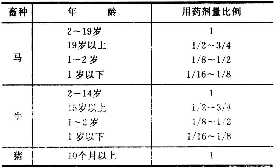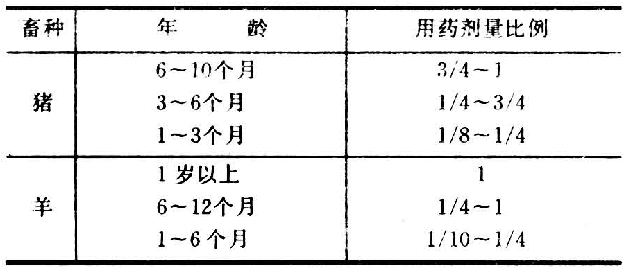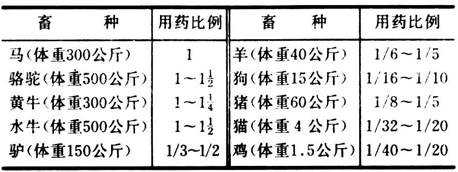 表2 不同年龄家畜用药的剂量比例