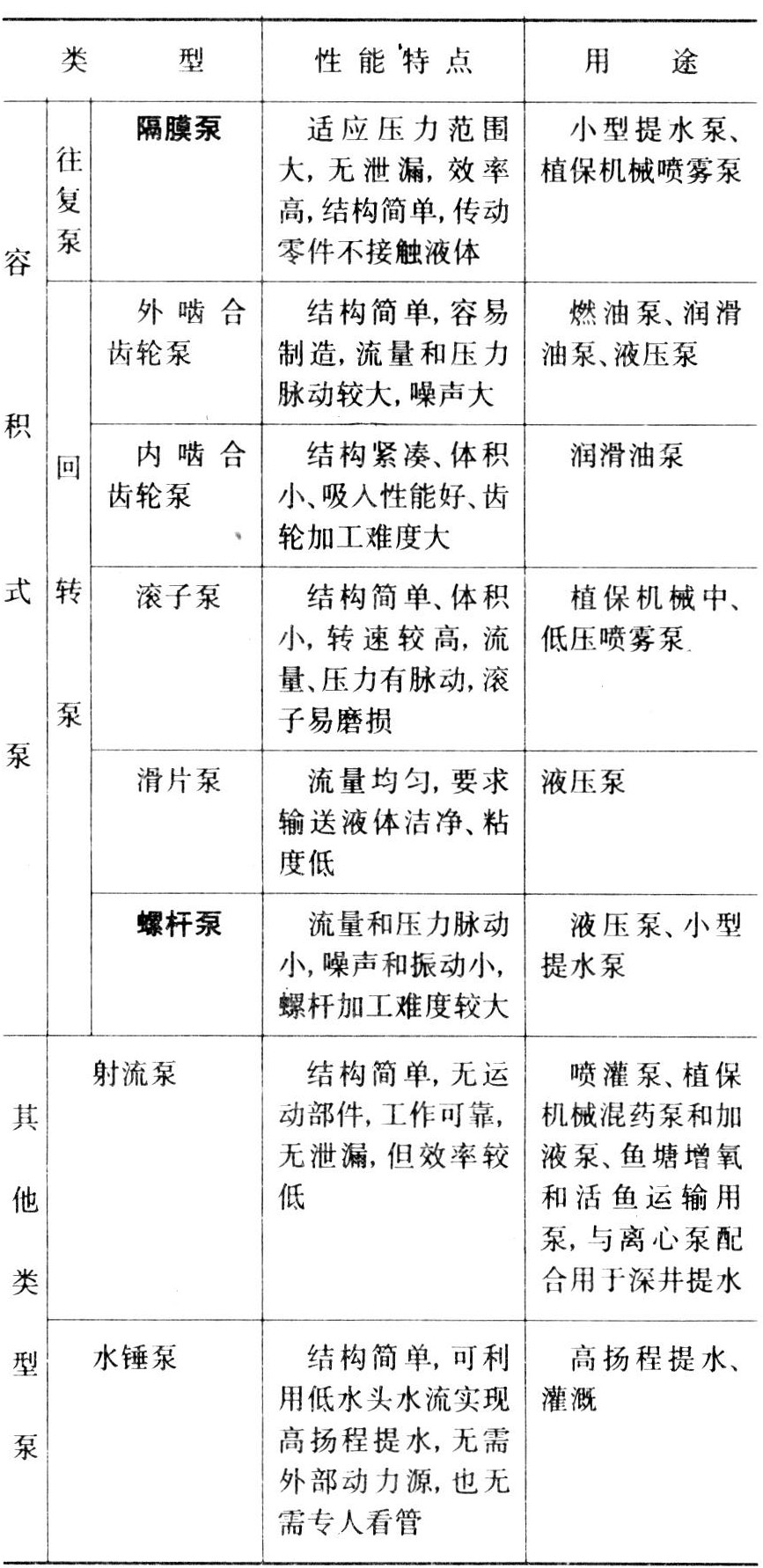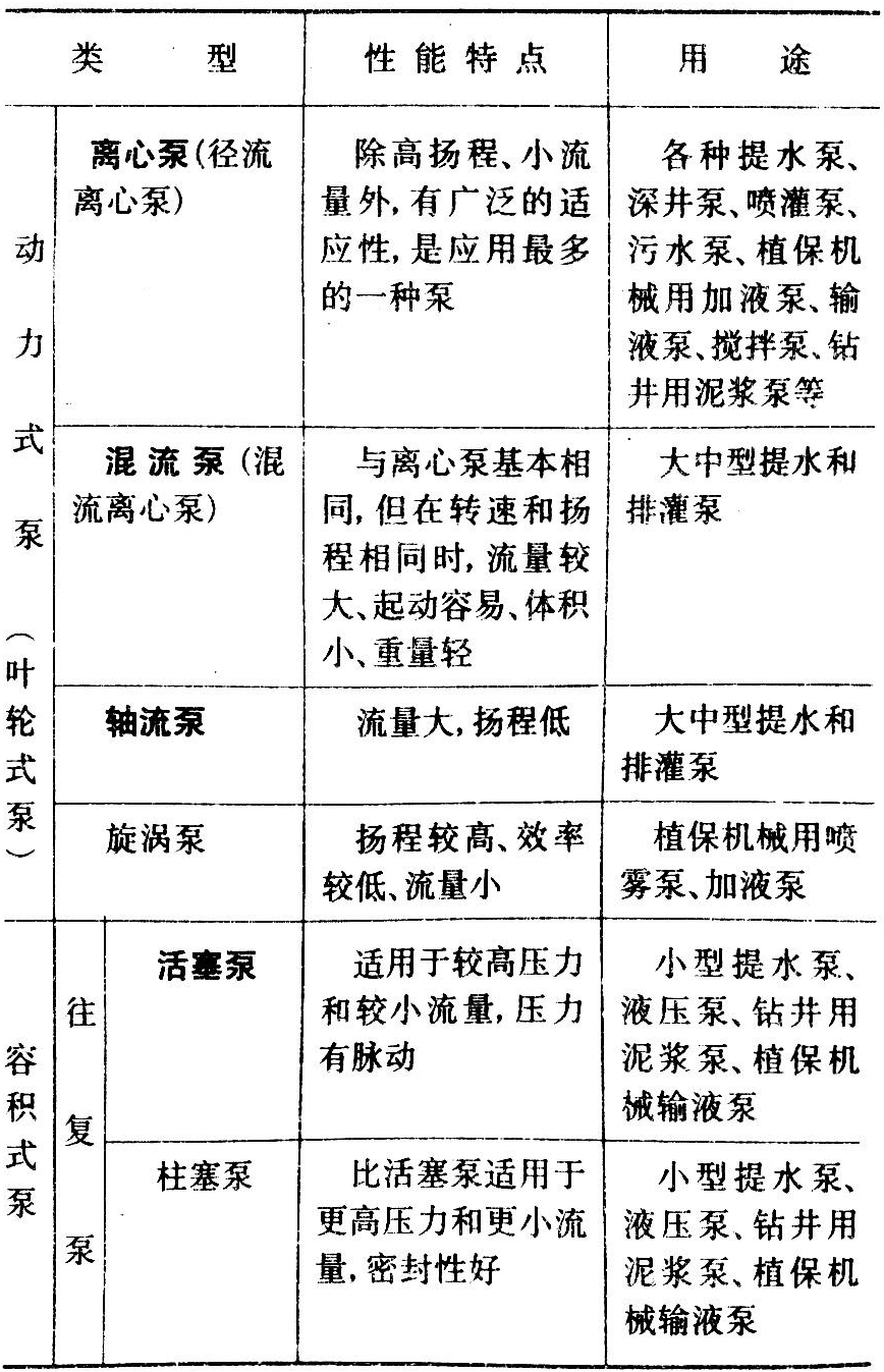 泵作为一种机具或机器部件,广泛应用于农业排灌供水机械、植保机械和农用动力机,见上表。