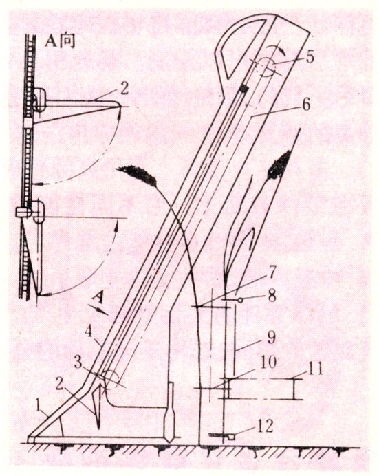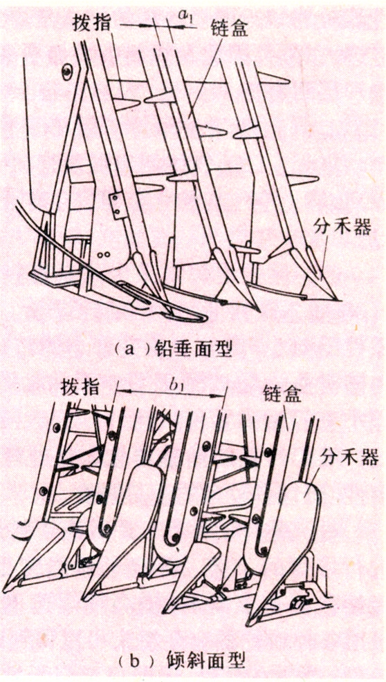 能扶起倒伏角在75°左右的作物。扶禾器的工作元件是安装在扶禾链上的拨指。常见的扶禾器有铅垂面型和倾斜面型两种(图3)。前者的扶禾链在铅垂面内运动;后者的扶禾链在倾斜面内运动。扶禾器一般用在立式割台的割捆机和半喂入联合收割机上。
