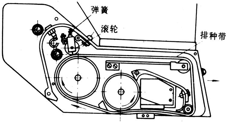播种机上用于监视排种器工作情况的装置。主要用于精密播种机。当某一行排种器发生故障,种子不排出或阻塞时,通过传感器能及时地自动报警,并指示出发生故障的所在行位置。 精密播种机上采用的监视器,主要有机电式和光电式两种。机电式播种监视器一种装在型孔带式精密排种器上的监视器(图1)。传感器是一个靠弹簧压紧在排种带上的胶木滚轮,在排种带的带动下旋转。