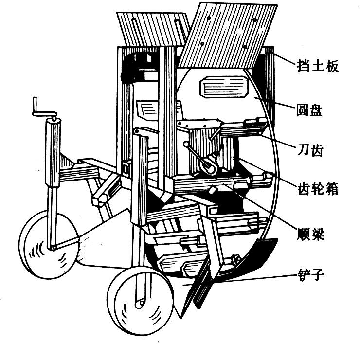 起土铲的工作幅宽依配套拖拉机功率而定。如东方红—75拖拉机配套的铲抛机工作幅为1.3~1.6米。为减少铲土阻力,前铲正中部分多为三角形,铲土角为13°~17°;前铲两侧通常采用圆锥形曲面,以减少碎土和翻土功率消耗。圆盘式铲抛机的抛土圆盘直径取1.2~1.4米。为提高抛出土的相对集中程度,抛土刀齿形状多为细长形,刀齿抛土工作面相对于抛土圆盘径线后倾10°~15°;抛土刀齿数目多,有利于提高抛土能力和抛出土的相对集中性能。但数目过多,会影响铲起的土壤向抛土刀齿的顺利喂入,一般两刀齿的弧间距离取0.25~0.35米,刀齿数为8~12片,抛土刀齿的线速度为6~15米/秒。通过变速机构换档分级可满足作业中不同抛土距离的要求。