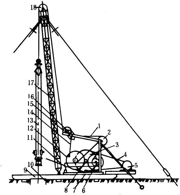 由机架、冲击机构、工具卷筒、桅杆、钻具等组成(图1)。工作时,由电动机经胶带驱动主轴,通过由冲击齿轮、曲柄连杆及冲击梁组成的冲击机构带动冲击梁往复摆动,牵引钢丝绳使钻头作上下运动。当向下运动时,由于钻具的重量产生冲击力,以钻头破碎井底岩层,如此反复钻凿一定进尺后,再用抽砂筒将岩屑、泥沙、卵石等打捞出来。由于这种钻机冲击钻进时一般只是向井口加水或加不同浓度的泥浆而不需用泵抽吸,因此结构简单,容易制造,造价低,适宜在各种粘土、砂砾石、卵石等地层钻凿深度不超过300米,孔径500~600毫米的水井。