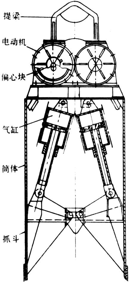 一种放入井孔内的电动机和钻具连成一体,靠振动、冲击作用破碎岩层的钻机。一般作为一种附件与有提升装置的机械组合起来使用,其结构如图2。工作时,两台电动机分别带动其轴上的偏心块作相反方向旋转。在起动后一个很短暂时间内,由于质量守恒原理,两台电动机能自动同步反向回转,从而产生上下方向的简谐振动,带动简体一起上下振动,当筒体向下运动时,抓斗在振动冲击作用下靠其环形刃口在直径1米的圆周上切入地层;当沉入到一定深度后即开动气缸推动两个抓斗合拢,将岩屑抓入筒中,提出井口后张开抓斗放出岩屑。这种钻机结构比较简单紧凑,适用于粘土或较松散地层钻凿大口径的水井,钻进效率也较高,但井深加大时效率显著下降,钻直径1~1.2米、深40~50米的水井时,钻进效率为1.6米/小时。