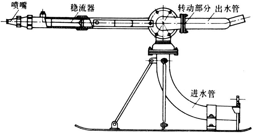 进水管是一个90°的弯管,上部焊有法兰盘与密封转盘相接,下部焊有止水盘,用活动法兰与水泵的出水管连接。转动部分由水平转盘、垂直转盘及联结它们的小弯管组成,联结在进水管和出水管之间。水平转盘与垂直转盘结构相同,靠上下左右回转枪管,变换冲击方向。转盘的内外套之间装有滚动轴承和橡胶密封圈,使水枪操作灵活轻便又不漏水。出水管呈圆弧形,它是维持枪体和操作平衡的部件,由一个弯曲的钢管和一个铸造的小弯头用法兰盘连接而成。出水管前端装有稳流器,它的作用是消除水流经过枪体的几个弯管之后所产生的涡流与紊流,改善水流的密实度。稳流器长度为150~180毫米,结构型式有“Y”型、“十”形等。喷嘴是冲土水枪的出水口,采用优质钢材精细加工而成,内孔为圆锥体镀硬铬,出口直径有16、17、18、19、20毫米等。底座用于联结和固定水枪各部零件,并使水枪放置平稳。