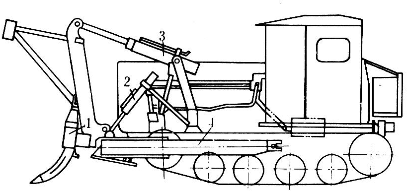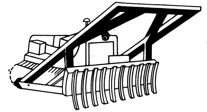 由带挖根齿的工作头、大梁、推树架和升降机构组成(图1)。悬挂在拖拉机的前方。主要靠拖拉机的推力挖除树根。工作头上一般装有4~10个挖根齿,中间装有护板,以防树枝、树根损坏拖拉机。大梁与工作头有刚性连接成的整体结构;或通过位于大梁前端中央的球形铰链和两侧的三角拉杆与工作头联结的可换式结构。可换式结构可根据不同作业将推齿式工作头换成割灌铲刀或推土铲。挖砍伐过的树桩时(通常不装推树架),在距树桩约1~1.5米处将工作头放下,机器向前开动,挖根齿斜插入土,进入树桩根部,入土深度40厘米左右。机器前进将树桩推斜,继而提升工作头,将树根挖出。遇到直径较大的树桩,可以用挖根齿先挖除树桩的侧根,再将工作头对准树桩挖除主根。挖根所需作用力的大小与树桩直径、树种根系情况和土壤状况有关,可按经验公式P=Kd3/2计算。式中P为水平挖根阻力(千牛);K为系数(K=0.5~0.6);d为树桩直径(厘米)。当挖除未经砍伐的树木树根时,可装上推树架。工作时先由推树架将树推斜,继而挖根齿插入根部将树连根挖出。这时入土深度一般为15~35厘米。由于推树架增加了推树作用力矩,所以能提高生产率。其缺点是拖拉机受冲击载荷,影响拖拉机底盘的寿命。挖根力受拖拉机推力的限制,一般只适合挖除直径40厘米以下的树桩。