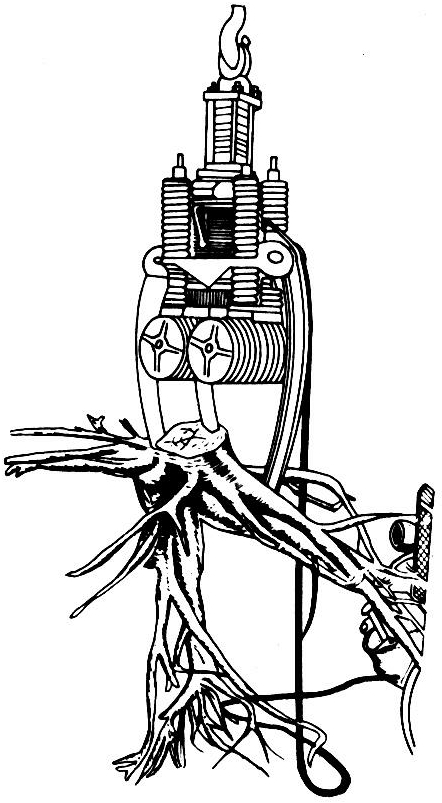 悬挂在拖拉机的后方,靠拖拉机的牵引力拔除树根。工作部件的型式有挖根齿式、夹钳式和掘根铲式等。挖根齿通常为1~4个,工作时插入树根下,拖拉机向前开动,将树根拔出。夹钳能夹紧树桩,靠拖拉机的拉力拔出树根。掘根铲则能深入到40~90厘米处,将树根切断,再将其挖除。拉拔式除根机的除根力受拖拉机牵引力的限制。当一次挖不出树根时,行走部分打滑会破坏土壤结构,同时影响底盘及行走部分寿命。