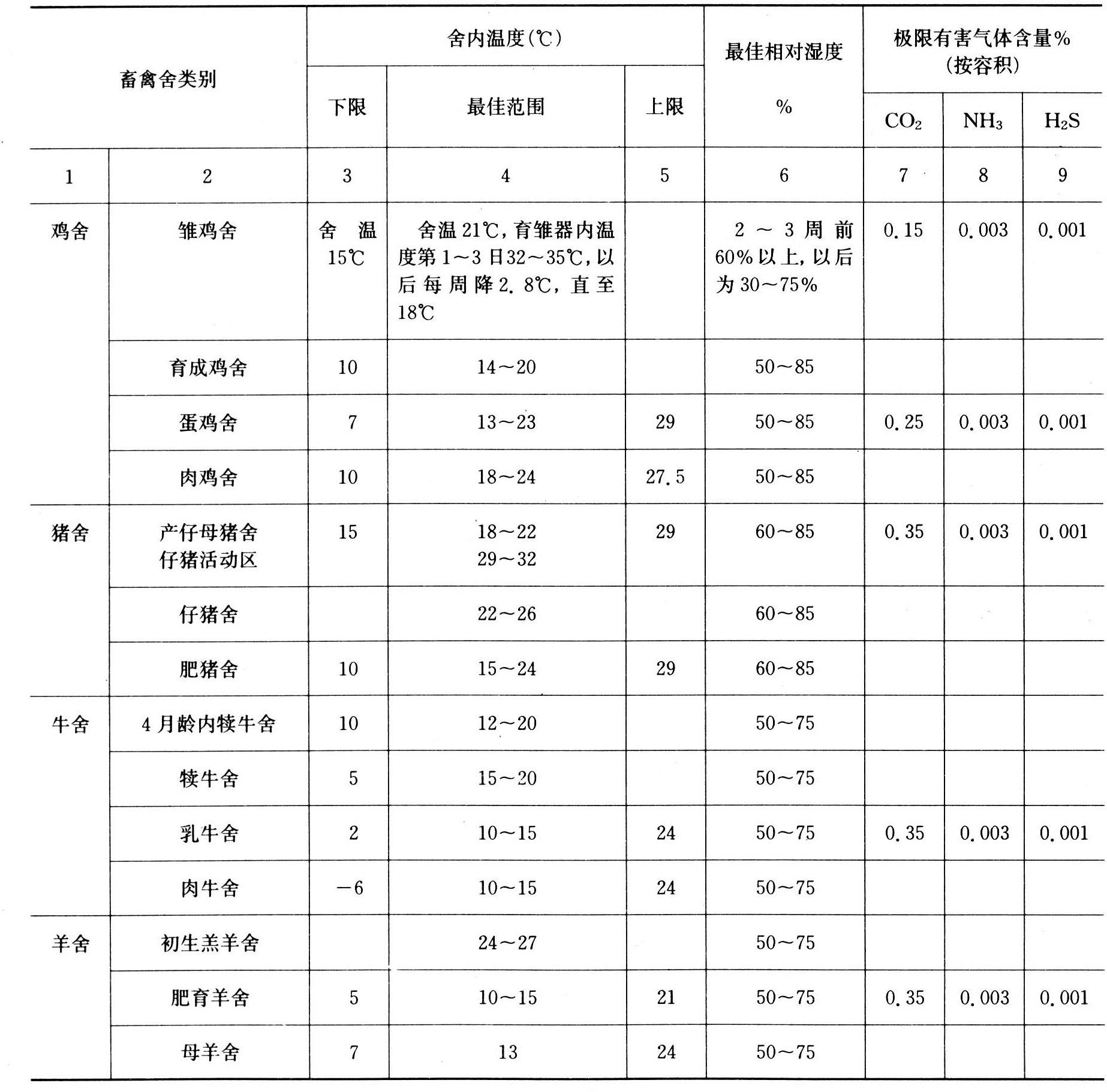 表1 畜禽舍的合理环境因素