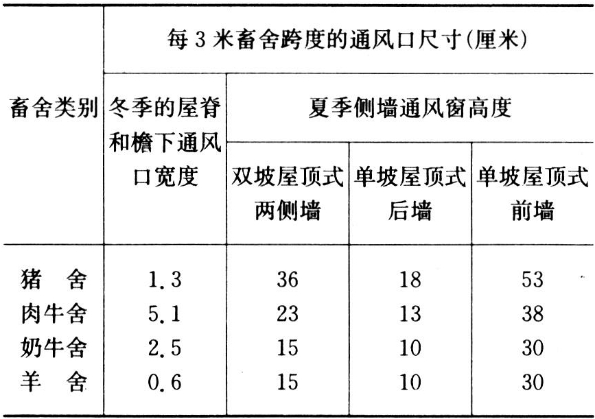表2 畜舍自然通风的通风口尺寸