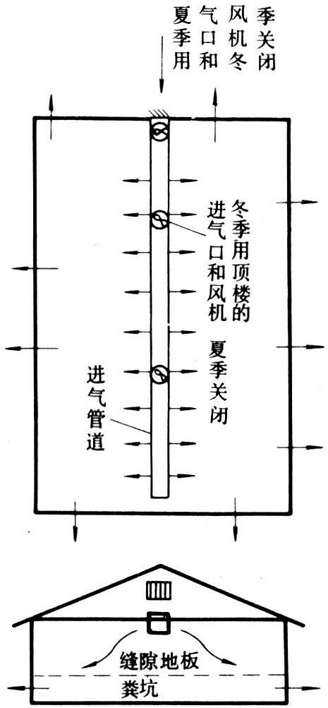 进气式机械通风系统(图3)中的风机将新鲜空气通过舍内上方管道上的两侧均布孔送入畜禽舍,使畜禽舍内形成一定的压力,舍内污浊空气即在此压力下通过排气口排出,如有缝隙地板,此排气口一般都在地板下方。畜舍跨度为7.5米以下时需1根管道,7.5~15米时需2根管道。管道上每一对直径5厘米的孔可负担30~60米3/小时的通风量。由于舍内有压力,在冬季会使空气中水汽渗入墙中和天棚上而降低保温能力,也会因渗入门缝而引起结冰,风机所需功率也较大,所以这种通风系统只用于畜舍的改装。