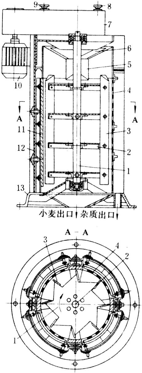 用于清除粘附在麦粒表面的污垢、麦毛、虫卵等杂质并打碎土块的干法清理机器。小麦经过筛选后,麦粒表面尚未达到理想的干净程度,需要用打麦机打下麦粒表面粘附的灰尘、嵌在腹沟内的泥沙,以及麦毛和部分表皮,并打碎强度低于麦粒的土块、煤渣以及虫蚀麦、病害变质麦等,然后利用吸风与筛理作进一步的分离,以提高入磨净麦的纯度。