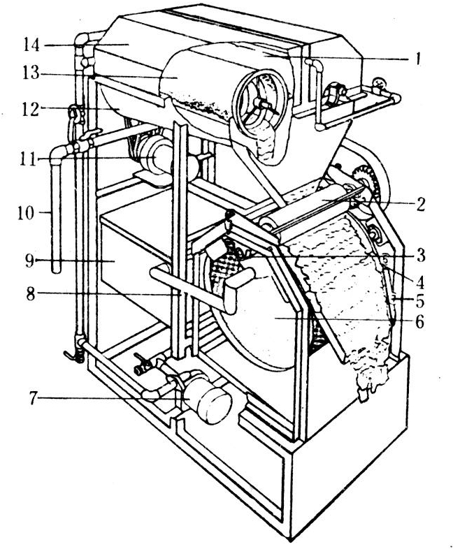从沫糊(又称豆糊)中提取豆浆的设备。按滤浆方式不同,可分为筛分式、离心式和挤压式三类。使用的滤网一般为27~47孔/厘米。筛分式有振动平筛和旋转圆筛等。离心式浆渣分离机的工作部件是内表面安装着滤网的锥形转鼓(筛篮)。转鼓小端内部设有与进料管相通的分配盘。沫糊从进料管流到高速旋转的分配盘时,在离心力作用下,均匀地沿转鼓内表面从小端向大端移动。豆渣沿滤网不断地被推向转鼓大端而排出,豆浆则穿过滤网流向外壳,集中排出。挤压式浆渣分离机有等螺距变直径和等直径变螺距两种。沫糊由螺旋推向压力门的过程中,由于螺距间空间容积逐渐减小,沫糊受挤压,豆浆经筛筒滤出。豆渣被螺旋推至端部,挤压弹簧压力门而排出。调压弹簧用以控制滤净所需的压力。图3是日本豆制品生产线比较常用的一种筛分与挤压组合滤浆设备。沫糊先经圆筛滤出第一道浆(存入豆浆罐),再将所得的渣稀释,经挤压胶辊与滤浆筒挤出浓度低而含细渣的豆浆,此浆流入沫糊罐与沫糊混合,再泵送到滤浆圆筛过滤,以降低豆渣中残留的蛋白质。