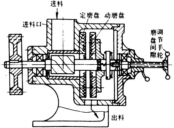 用来将浸泡膨胀后的大豆磨制成沫糊浆,使其细胞膜破裂,蛋白质溶于水中。常用的是片磨和锤式粉碎机。片磨通常有石磨、钢磨、砂轮磨之分,通常采用能使浆渣自动分离的砂轮磨。图2是砂轮磨浆机。