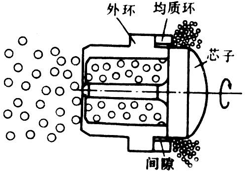可将大豆直接制成豆奶,其工艺流程如图4所示。全过程中使用的主要设备包括脱皮机、磨浆机、浆渣分离机、调合搅拌罐、杀菌除臭装置和高压均质机等设备。其中磨浆、分离与豆腐加工使用的设备相同。一般采用干法脱皮,相应的脱皮机由烘干、破碎、风选分离三部分组成。通常采用的破碎设备如图5。脱皮后的大豆放在筒形容器内,通入蒸汽短时间加热或用碱性热水浸烫,使大豆中的脂肪氧化酶钝化。调合搅拌罐将加入豆奶的植物油、糖、钙等成分搅拌均匀,可制成不同风味的豆奶。杀菌除臭装置通常由一个可使豆奶与140℃的高压蒸汽进行短时热交换的加热器,以及用以减压脱臭的脱臭罐所组成。均质机的作用是使浆液混合物颗粒达到均匀细化的目的。主要包括高压泵、反压装置和均质头。均质头的工作原理如图6所示。豆奶混合液由高压泵送入外环与芯子之间的缝隙,在此细缝中,混合液受阻,高压能被转化成动能,混合液颗粒受到极大的剪切力和冲击力等作用,达到均质的目的。
