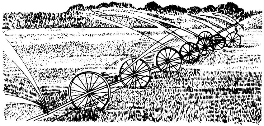 由十几根外径100毫米铝管联接成的400多米长的喷洒管道,利用许多滑橇和轮架支承,每隔12~18米装有竖管、喷头和溢水阀。实行定点喷洒,由拖拉机牵引变换作业地块。