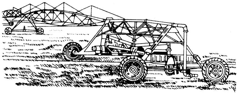 由动力机、水泵、管道、喷头、行走机构、控制系统以一定形式组合起来的宽幅式喷灌机具。配套动力11~40千瓦为中型喷灌机,40千瓦以上的为大型喷灌机。大中型喷灌机单台机组控制喷灌面积较大,机械化和自动化程度较高,适用于大面积农田、草场和劳力紧张地区。双臂不转式喷灌机苏联ДДA—100M型双臂不转式喷灌机是把110米带低压喷头的三角形桁架配置在履带拖拉机上。