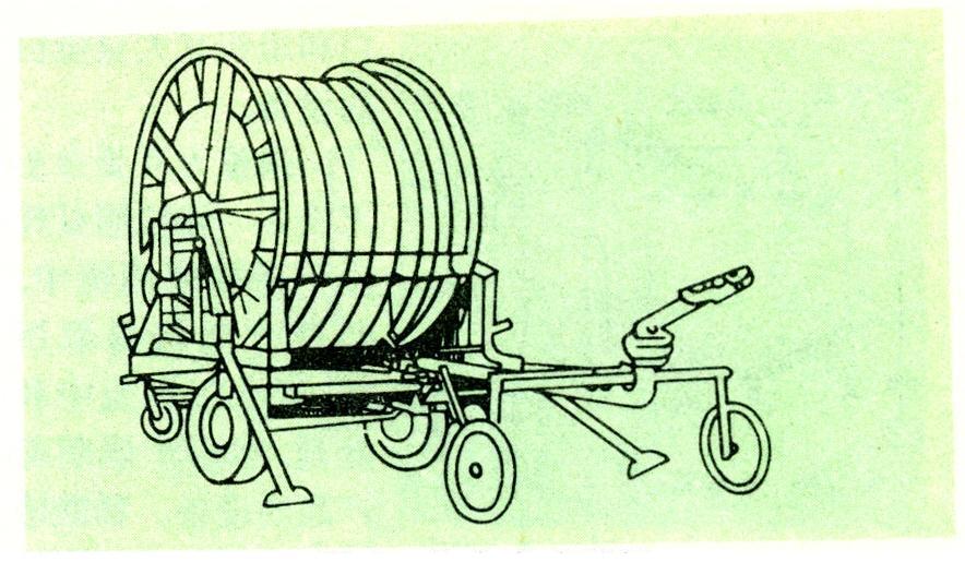 利用聚乙烯挠性管输水兼作牵引钢索用的远射程喷灌机(图3)。主要由水泵、绞盘、聚乙烯管、喷枪车、自动调速装置和水力驱动装置等部分组成。当压力水通过水涡轮时驱动绞盘转动,卷绕着聚乙烯管使喷枪车向后走,进行扇形喷洒,形成一条120×445米的矩形湿润带。主要用于牧草、谷物灌溉和矿山除尘。