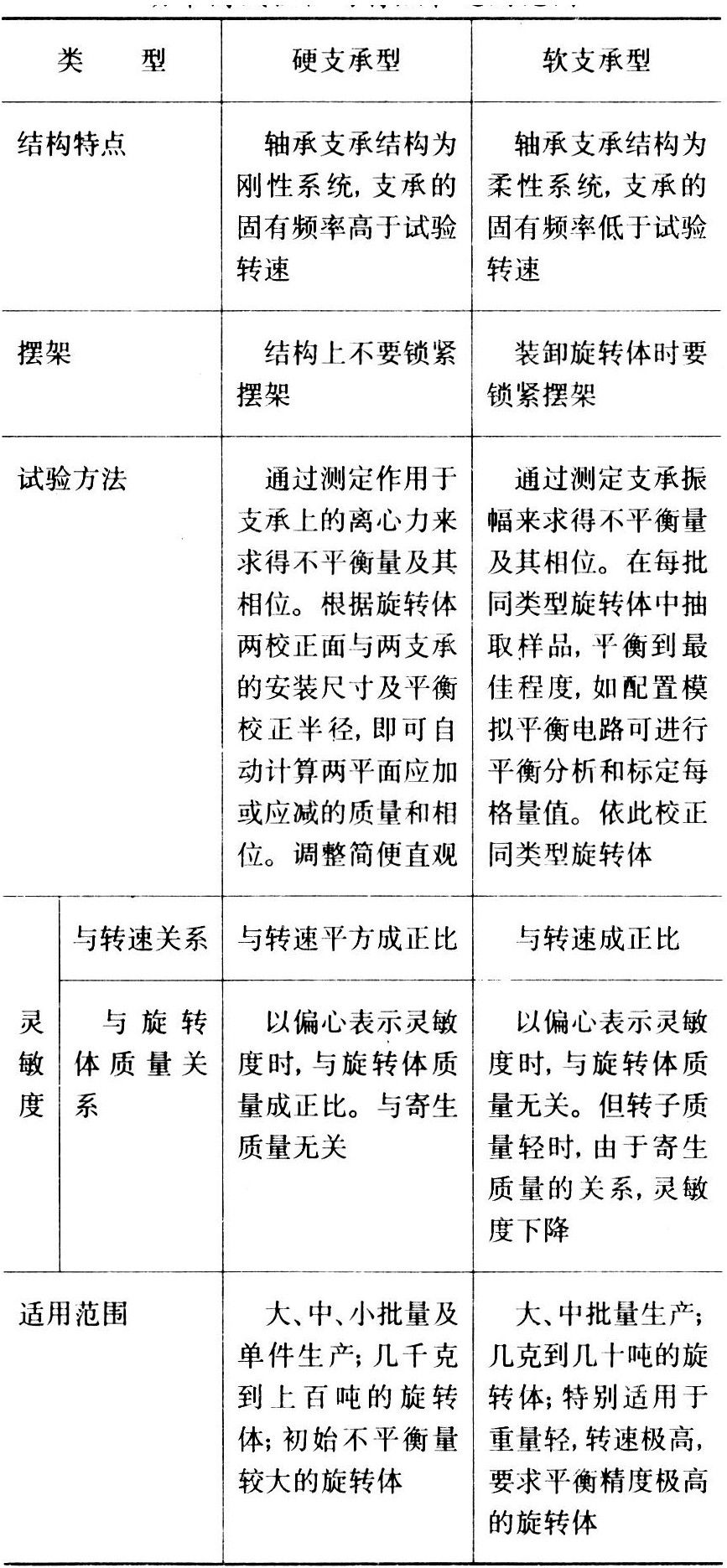 按待试旋转体安装的位置分为卧式和立式;按测量原理分为硬支承型和软支承型,其特点和适用范围见左表。