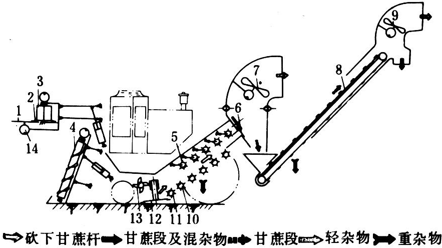 结构如图2,能一次完成切梢、扶倒、切蔗、清理和切段等工序。它适用于倒伏甘蔗的大块蔗田单行和双行收割,但收获前需烧去蔗叶。作业时,割台部分的工作过程与整秆式甘蔗联合收获机相似,切断后的蔗秆经提升辊和上、下输送辊送到切段装置。被切成20~30厘米的蔗段,先后经两个轴流风机吸除轻杂物,较重的杂物在升运过程中从升运器底板的孔中排出,蔗段则由升运器送入机旁同时平行的装运车中。国外使用的机型为配套动力80~145千瓦的大型液压自走式,生产效率可达35~60吨/小时。中国使用的机型一般与40千瓦左右拖拉机配套。