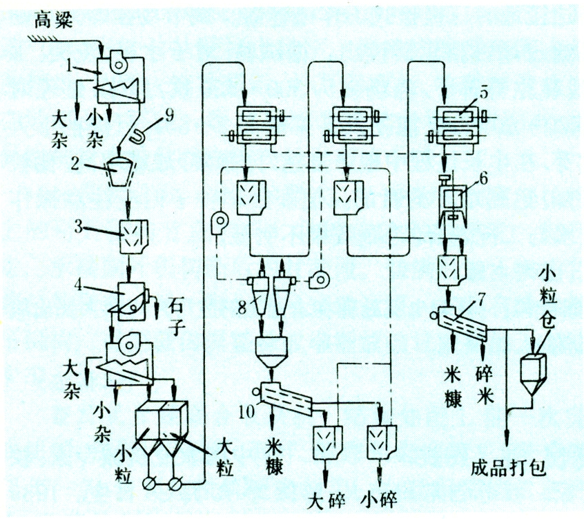 将高粱加工成不同等级成品高粱米的成套机械。按加工工艺可分为:高粱清理和分粒设备;高粱碾米和成品整理设备;下脚料和副产品(米糠、碎米)处理设备等(图1)。
