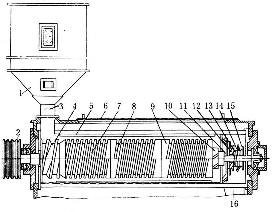 高粱碾米因高粱皮层粘厚,并含有单宁,去皮比较困难,通常采用多道碾削型碾米机碾白。除采用横式三节砂辊碾米机、双辊碾米机和立式砂臼碾米机外,还可用二节砂辊碾米机、立式三节砂辊碾米机和立式凸形砂臼碾米机等。20世纪80年代研制成一种适应于杂交高粱和粉质高粱的新型高粱碾米机即螺旋米机(图2),高粱在由螺旋推进器、三节螺旋砂辊、米筛和米刀等部分组成的碾白室内,主要依靠碾削和擦离作用去皮。属于混合型碾米机。每节砂辊直径×长度为φ215×289毫米,全部采用螺旋砂辊,碾白效率较高,去皮均匀,破碎率低,出米率高,并可减少碾米道数。已被推广使用。