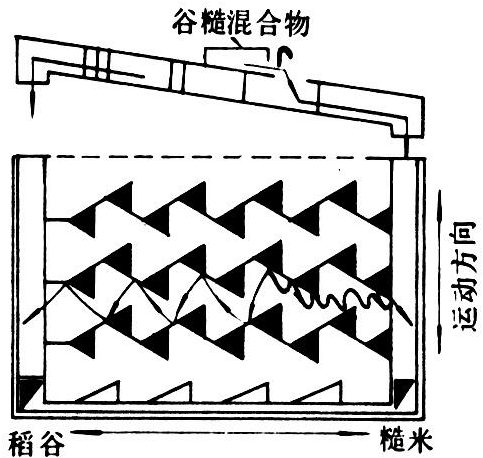 巴基机的分离原理如图2所示。它是利用稻谷和糙米表面摩擦系数、比重和弹性等物理性质的差异进行分选。谷糙混合物从进料机构落入装有三角形挡板分离台的分选曲槽中,由于分离台作往复运动,谷糙混合物受惯性作用而左右摆动。在运动中,混合物产生自动分级,稻谷上浮、糙米下沉,与曲槽凸出的三角形挡板发生撞击作用,因稻谷的弹性较强,又浮于上层,与三角形挡板产生较大的撞击力,使稻谷向分离台上方移动。糙米集聚在分离台曲槽底部,因其弹性较差,表面光滑,不能与三角形挡板连续撞击,而顺着分离台下方滑动,使谷糙得到分离。
