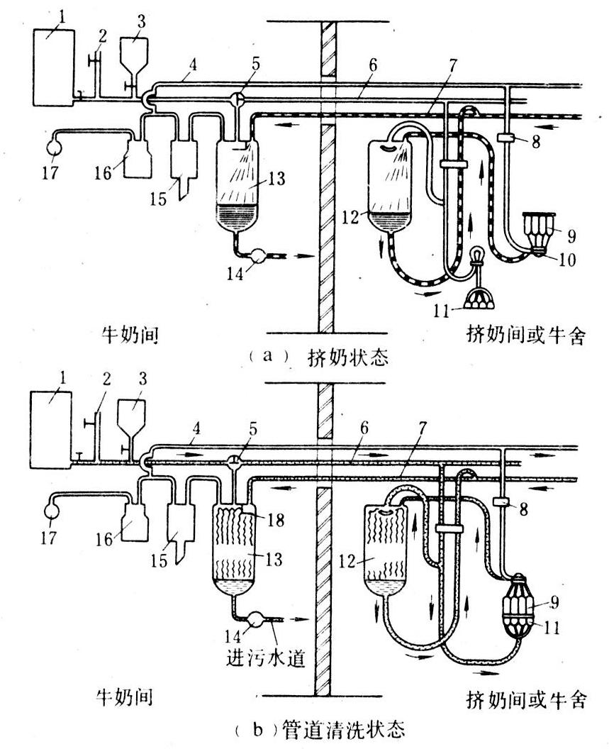 主要由挤奶器、真空装置、管路系统、清洗装置、贮奶罐等组成。一般不配置牛奶计量器,挤奶和输奶合用一条输奶管路[图1(a)]。为便于检修和观察内部液体流动情况,常采用高配管式输奶管路,管路配置高度约为人的视线高度。但必需使用较高的真空度来提升牛奶,乳头易受刺激,也容易引起管路内的真空不稳定。为保持挤奶真空度的稳定,宜采用两套独立的真空装置,一套专供脉动器使用,真空压力保持为51千帕;另一套供挤奶和输奶用,真空压力可达74千帕,同时在集乳器前增设一个真空减压器,使挤奶杯乳头室的真空压力仍保持为51千帕。