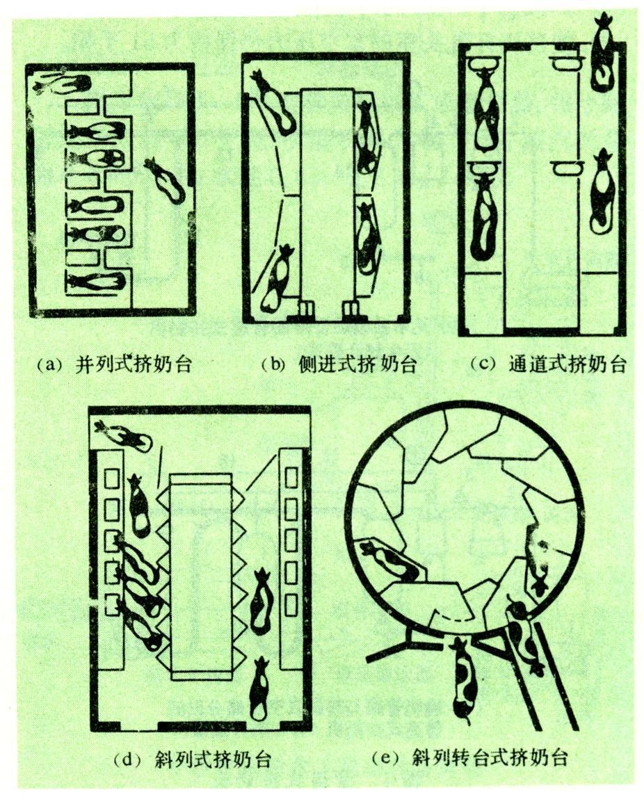 奶牛在挤奶间式挤奶机挤奶时站立的地点。按工作方式可分为固定式、转台式和传送带式;按奶牛在挤奶台上的排列方式可分为并列式、侧进式、通道式和斜列式(图3)。按挤奶台围绕工作坑四周的边数又可分为单边形、双边形和多边形等。并列式固定挤奶台的挤奶栏与牛舍的牛床排列相似,牛与工人位于同一平面或高出250~400毫米,以减少弯腰操作。奶牛可单独进出挤奶栏。每人每小时挤奶不超过35头。侧进式固定挤奶台的挤奶栏排列在工作坑的两边,牛在挤奶栏内头尾相接,栏侧有前、后门,供牛单独进出,工作坑低于地面800~900毫米。通道式固定挤奶台与侧进式相似,挤奶栏分隔门拉出时就形成统一的挤奶栏通道,奶牛须按批进出,但挤奶间跨度小。侧进式和通道式挤奶台上前后挤奶器之间的距离有2.4米,为避免操作者走动距离过长,每一工作边的挤奶栏数常为2~3个。侧进式挤奶台配合辅助操作的机械化,每人每小时最高可挤奶50~63头。斜列式固定挤奶台上挤奶栏排列方向与工作坑纵轴成30°~55°角,奶牛分批进出挤奶栏,但前后挤奶器之间的距离缩短到0.9米,所以在挤奶间长度相同的情况下可设置较多的挤奶栏(每边4~10个),每人每小时最高可挤奶83~92头,多边形挤奶台较常见的是菱形,每工作边都有一排斜列式挤奶栏,每边4~8栏,每人每小时最高可挤奶牛96~122头。挤奶速度慢的奶牛可安排在一条工作边上,以减少对挤奶间生产率的影响。