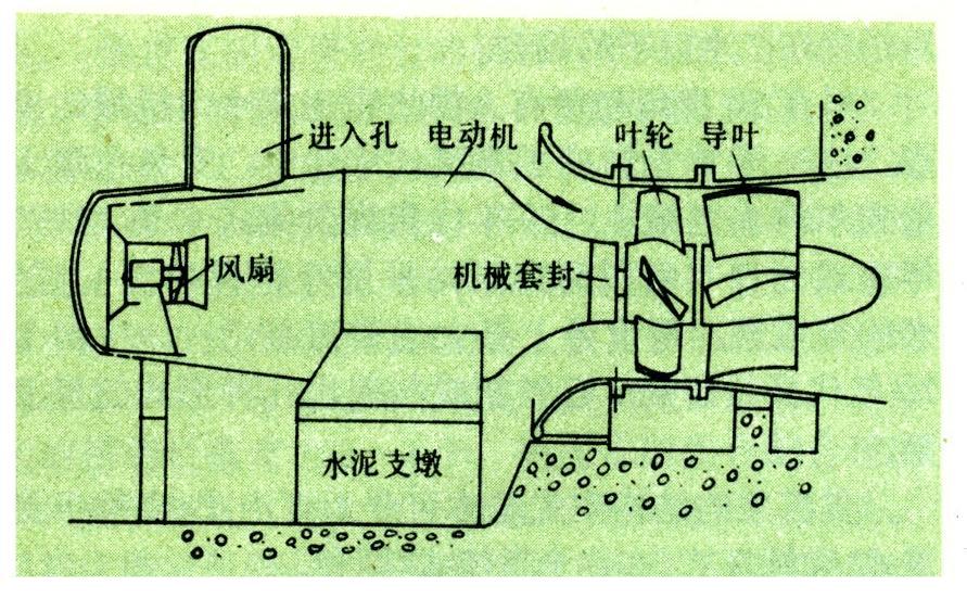 图2所示的开敞式前置灯泡贯流泵是将灯泡体置于开式进水池中,泵的叶轮直接装在电动机的轴伸上。是一种不用外壳的简化形式。轴伸处设有机械密封装置,也可用潜水电动机直接驱动叶轮,安装运行更为简便,适用于中、小型泵站。