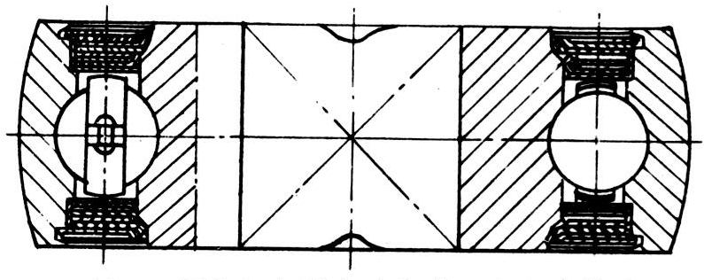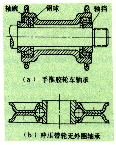 在农业机械上一些转速不高、负荷不大和精度要求不严的场合,有时也采用一些简易滚动轴承。有的简易滚动轴承具有成套的外圈、内圈和滚动元件,只是减小了外形尺寸和重量;有的则省去内圈或外圈,使滚动元件直接与轴颈或轴承座内孔接触等;也有的将内外圈改用冲压件等。图2是两种简化结构示例。