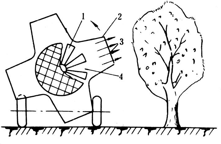 利用高速脉冲气流产生的作用力曳动果枝,使果枝产生顺气流方向的位移,当气流曳力减小或变向时,果枝反弹,使果实振摇而脱离果枝。其主要工作部件是风机和气流控制器(图3)。气流控制器的作用是使风机产生的气流形成脉冲、调节脉冲频率和控制气流方向。它是具有4个排气口的转筒,转筒内的风机出风口对准果树。工作时转筒旋转,当排气口对准出风口时,气流通过排气口吹向果树;排气口越过出风口时,气流中断。改变转筒的转速,气流吹出与停吹的变化频率随之改变,即调整了果枝的振动频率。采收葡萄时气流速度为100~150米/秒,频率为960~1440次/分。吹气式采收机由于气流的阻尼作用,使果实的下落速度降低,可减轻果实的碰撞损伤。但风机所需功率较大,较强的气流易损伤小枝和树叶。