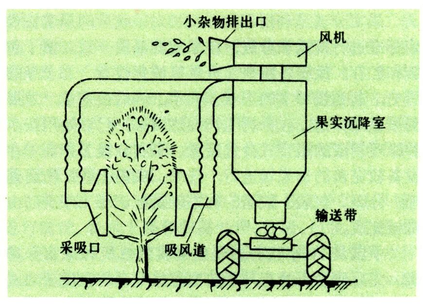 利用气流的吸力将果实吸入采果装置。其结构如图4。果实被吸气流曳下经采吸口、吸风道入沉降室,落到输送带上。树叶等小杂物经风机出风口排出。用于采收葡萄的气流速度为100~120米/秒。由于气流增大了果实的移动速度,果实损伤率较高。