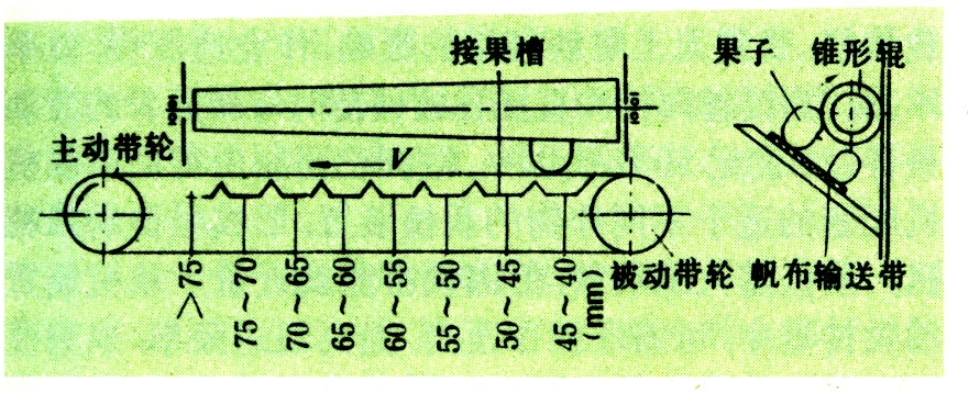 有三种类型:①由几层输送带组成的工作部件,输送带上分布许多圆孔,每层输送带的孔径不同,由小到大,果实经过各层输送带,不同尺寸的果实穿过输送带上圆孔落入各级接果槽中。②由并列两条圆形断面输送带组成的工作部件,输送带间的间隙由小到大,果实随输送带移动,不同尺寸的果实移动到相应尺寸的间隙时,便落入接果槽。该分选机可分选桃、苹果、梨、杏等果实,生产率较高,选苹果为1500千克/小时,选杏为800千克/小时。③由辊、带结合的柑桔分级工作部件,其分级原理如图5所示。输送带装在倾斜安装的带轮上,由主动轮驱动回转,输送带的侧上方装有转动的长锥形辊,辊带间的间隙沿V向渐增。工作时,在锥形辊和输送带两种运动的作用下,使果实基本上处于以果蒂为轴心的旋转状态并沿间隙滚动。当果实滚到失去锥形辊的支持时,便落入接果槽中。该种分选机分选合格率在95%以上,生产率为1500~2000千克/小时。