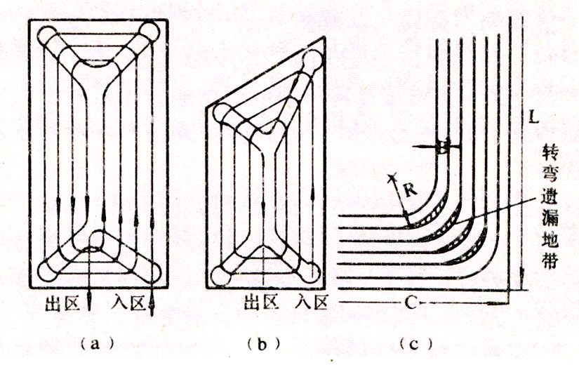 工作行程与地块或小区各边平行,可在工作状态下进行回转[图2(a)、(b)]。适用于谷物收获、割草和耙地等作业。但在转弯时易产生遗漏地带[图2(c)]。作业结束时需进行补漏作业。