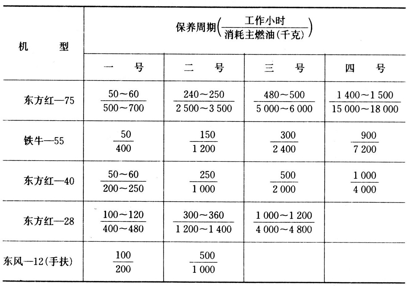 两次同号保养的间隔时间称为该号的保养周期。号别越高,周期越长,保养内容也越复杂。为便于执行,高号的保养周期往往是低号保养周期的整倍数,高一号保养的项目是在低一号项目上再增加若干新项目。拖拉机的保养周期见下表。