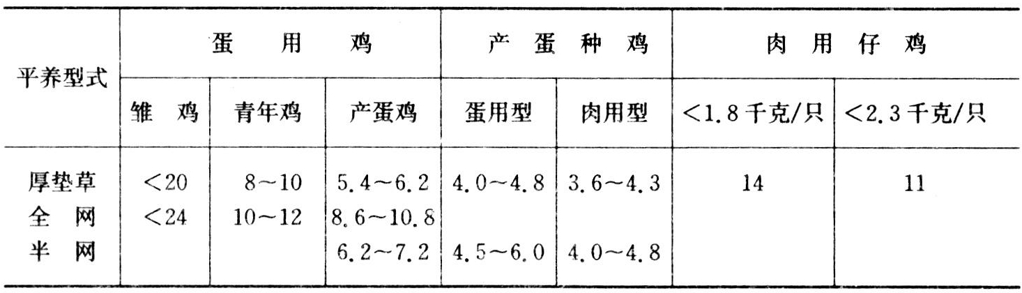 自然通风条件下平养鸡舍的舍饲密度见下表。机械通风条件下的舍饲密度则高于表中的数值。
