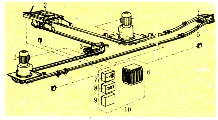 包括输送设备、击晕器、热烫机、打毛机、清膛机等。贯穿生产线的输送设备由成型导轨、链环、转角轮、电动机、减速器和驱动轮等组成(图1)。导轨被固定在屠宰间的屋顶下方,可通过伸缩杆改变其总体长度。链环多为Y字形,上端附有一对滚轮,可沿导轨滚动,各链环之间通过绳索而组成输送链。