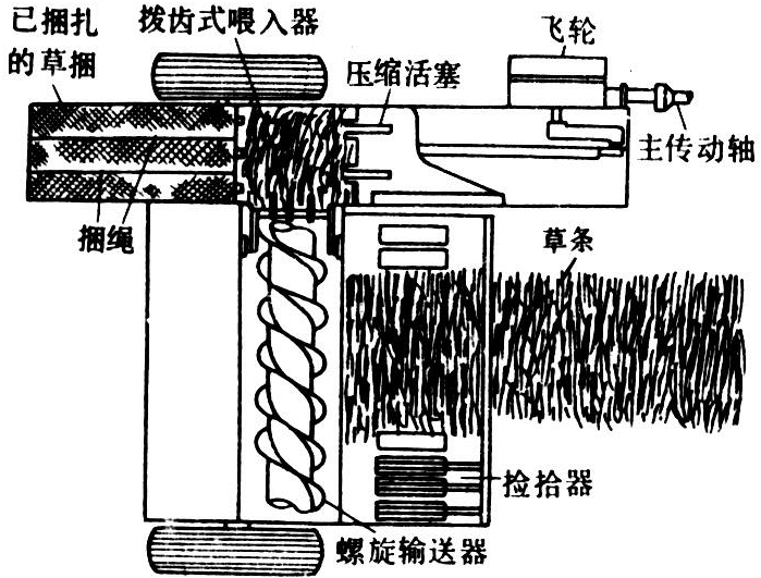 由压缩活塞和压捆室组成。随活塞的推移,压捆室中每分被压缩干草的密度逐渐增加,活塞的压力也逐渐增大,当压力达到最大值时,克服了后部已压缩干草和壁的摩擦力,整个干草被向后推移一距离,此距离即等于一份干草被压缩至最大密度时的厚度。一个完整的草捆是由若干这样厚度的干草层结合而成。在压捆室内设有止回爪,可避免在活塞返回时干草随着返回。为了在喂饲解捆时各草层能分开,在活塞端部上方和喂入口对应处还安置有切刀。