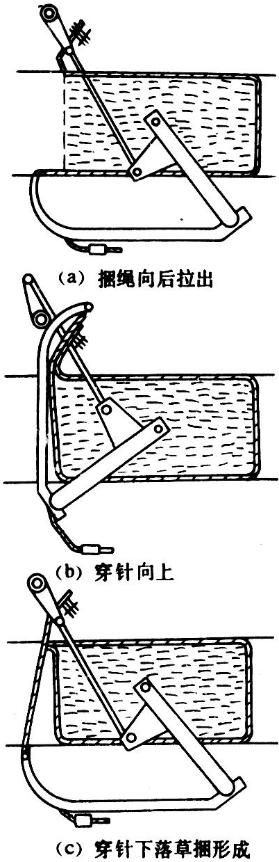 其功用是在压缩室内对草捆进行绕绳和打结,以保持草捆的密度和形状。工作过程如图2所示。草捆达到一定长度后,打捆机构轴开始转动,穿针向上引绳[图2(b)]至草捆室上面的夹绳器上方。夹绳器将绳夹住后,打结器进行打结并将绳切断,穿针带着一头夹在夹绳器的一股绳回复到原来的位置[图2(c)],使捆绳贯穿草捆室,压缩活塞送来的牧草推动捆绳并将其绕于形成中的草捆表面上,为下次捆扎作准备,这样不断循环。捆扎好的草捆逐个在草捆室出口处被排出。