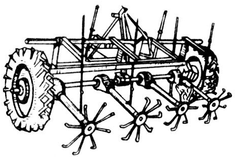 有旋转式与往复式两种。前者如图1所示,间苗工作部件是装有刀齿的刀盘,由动力输出轴或地轮驱动。刀盘盘面与地面垂直,刀盘轴线与前进方向大致相同。机具沿苗行作业时,刀盘转动,每个刀齿铲去一株或一些幼苗,留苗的株距可用增减刀齿数量,更换不同直径的刀盘,或改变机器前进速度与刀盘转速的比值来调节。有些间苗机的刀盘是借助地面的土壤阻力而旋转。往复式间苗机的工作部件是一个叉齿,由拖拉机动力输出轴驱动,工作时往复摆动,将多余苗株除去。