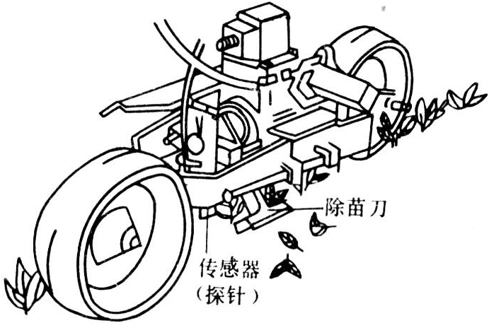 一般由传感器、电子控制系统、传动部件与除苗部件组成。传感器为带电的探针,当探针接触到选留的幼苗时,利用叶子表面的导电性,接通连地电路,触发控制电路,使除苗部件工作。图2所示的间苗机,它以苗高为判别标准。探针的高度位置可按选留幼苗的高度进行调整。当探针与幼苗接触时,位于探针前方的除苗刀就除掉选留苗前的幼苗。