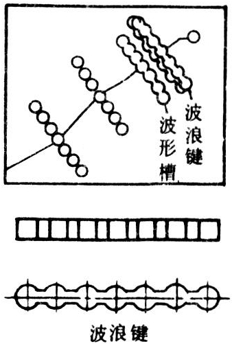 对承受较大载荷的零件也应采用一些补强措施。最简单的方法是在开出的V型槽底部点焊若干处之后粘补,波浪键粘接—扣合法可满足一般强度要求的机件修复。此法在垂直裂纹方向上加工出一定形状和尺寸的波形键槽(一般是在裂纹上钻孔,再用凿子开出头颈槽使各孔连起来而成),在槽内涂上胶粘剂,再把由特殊合金材料制成的形状与波形键槽相吻合的波浪键嵌入(图),用锤子铆击,使波浪键产生塑性变形而充满槽腔,借胶粘剂使波浪键凸缘与槽相互扣合,将损坏的机件重新牢固地连接为一体。