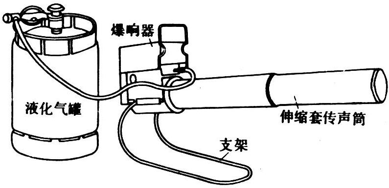 利用高压电点燃可燃气体,在瞬间产生很大的爆炸声以惊吓鸟类。爆音音量和爆发间隔时间可调节,亦可用能感受日出、日没的感光装置或计时器来自动控制每天起爆、停爆时间。图1是一种全自动惊鸟器。其音量调节范围80~120分贝,每隔1.5~30分钟爆炸1次,有效防治面积0.5~2公顷。用丙烷或丁烷气体作能源,一个装10千克气体的气瓶可工作12000~15000次。为了扩大控制面积,尚可增装三角架及弯形传声筒,每爆炸1次则自动旋转50°~70°角。这种惊鸟器除用于农业外,还用在飞机场、港口、雷达站、火箭发射基地等场所。