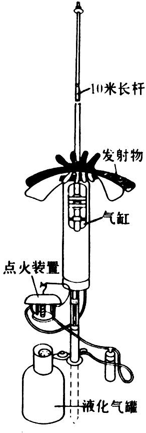 有一种是在4.5米高的立杆上使3米长的横竿旋转,带动金属丝和旗子在空气中旋转,产生光变幻作用,并可增强赶鸟效果。图2是一种光变幻装置追鸟器,由鸟形薄片发射物、10米铝制长杆、气缸、点火装置和丙烷气瓶等组成。气体爆炸使鸟形黑色和黄色薄片沿直杆上下运动,酷似鸟在空中飞翔,能使鸟类惊恐而飞离。夜间可更换一种涂有夜光涂料的蝶形板,发出青白光焰,可防夜行性动物的为害,有效作用面积约1公顷。爆音惊鸟器也可安装在追鸟器上,使声光效果结合,驱鸟效果更佳。