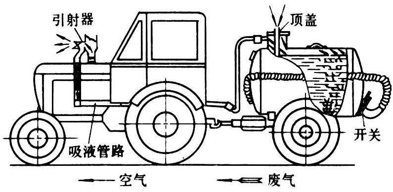 自吸式厩液施洒机(图1)是利用拖拉机的发动机排出的废气,通过引射装置将厩液吸入到液罐内,并将罐内的厩液排出。